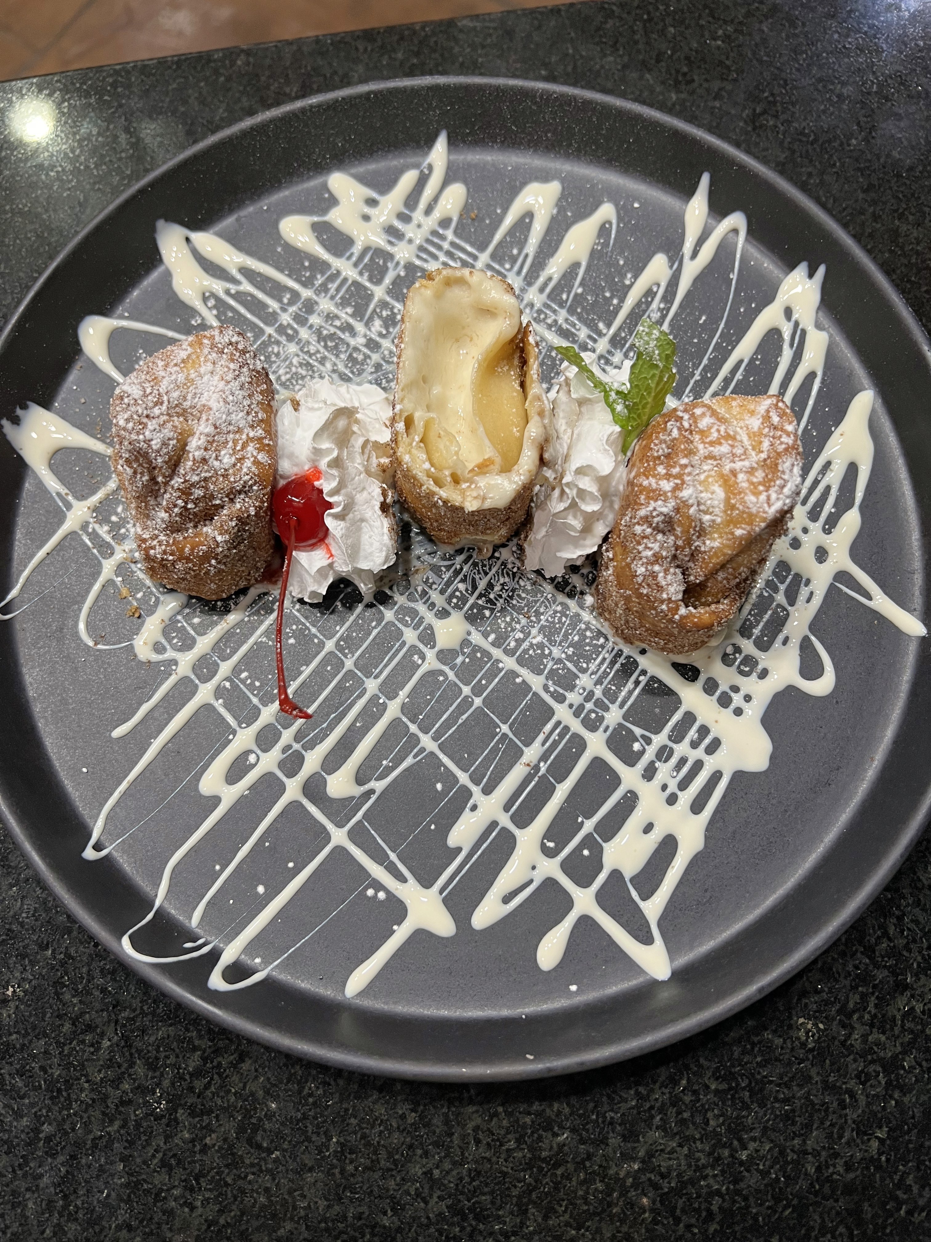 Bite-size churros filled with a warm, creamy cheesecake center. Fried to golden perfection, dusted with powdered sugar, and served over a sweet cream drizzle with whipped cream and a cherry on the side.