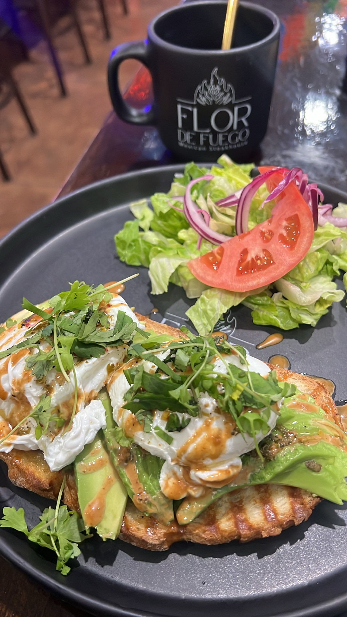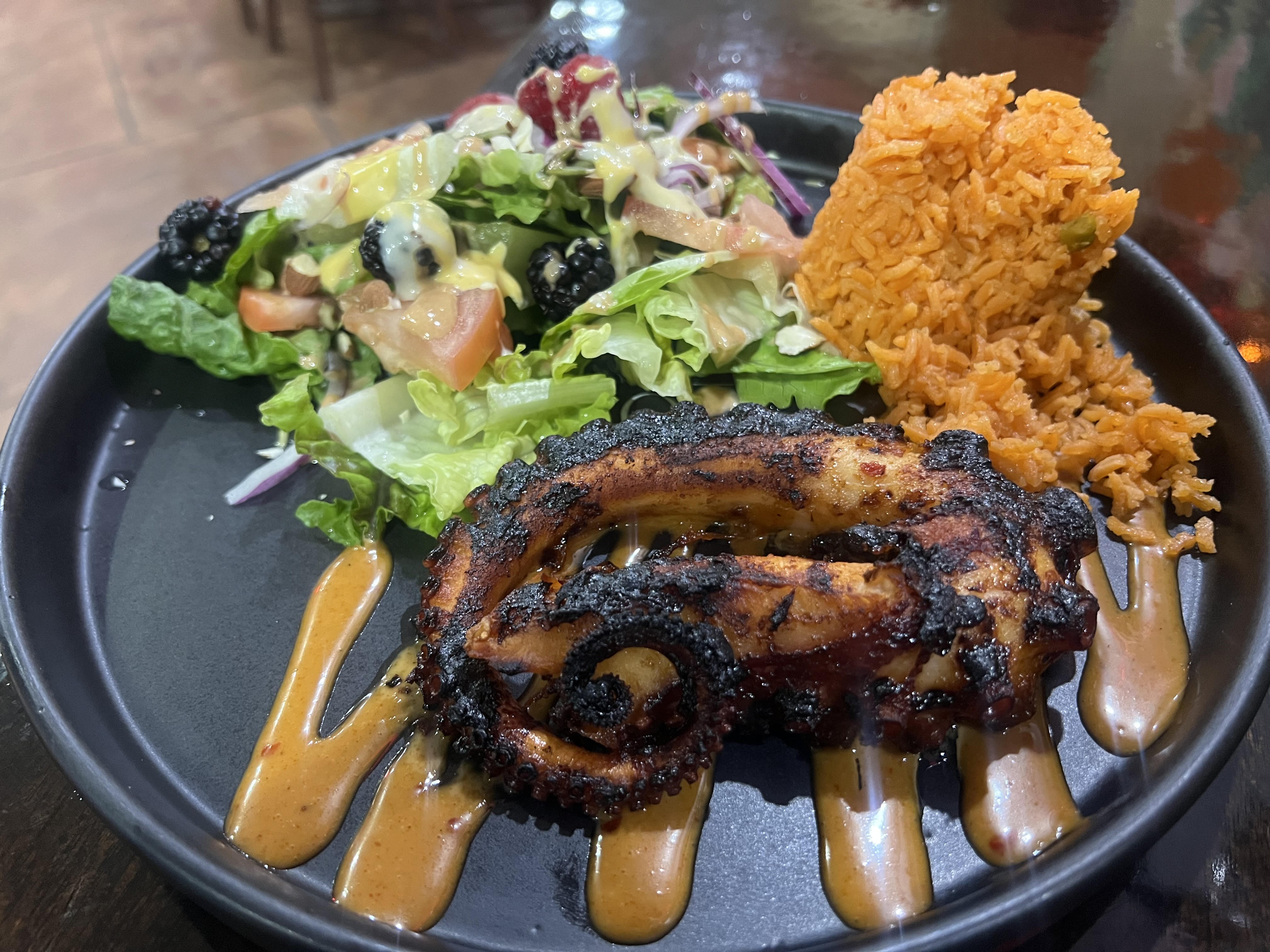 Grilled octopus, tender and lightly charred, served with a bold mole, or house sauces with rice, and salad. Smoky, earthy, and unforgettable — seafood with strength and soul