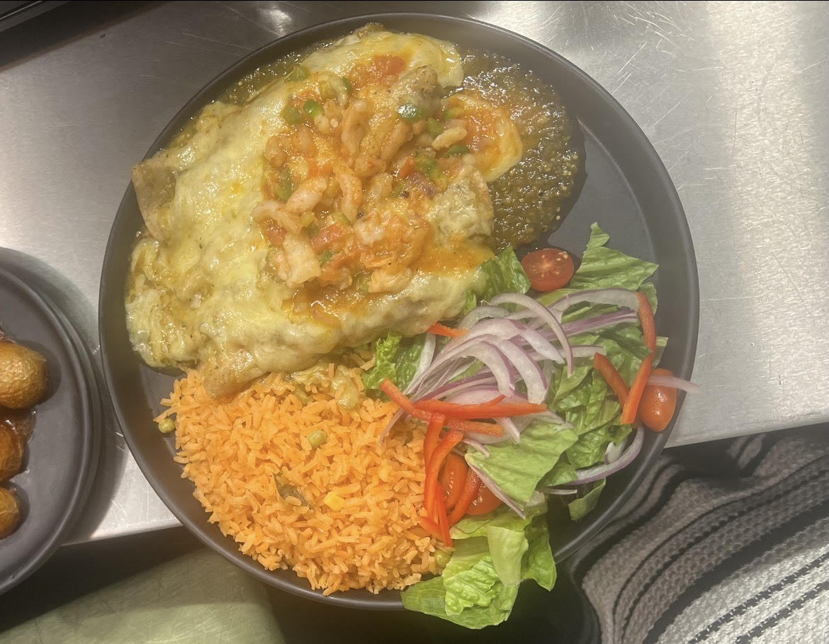 Three corn tortillas rolled and bathed in our vibrant green sauce, generously filled with juicy shrimp. Smothered in melted cheese on top.