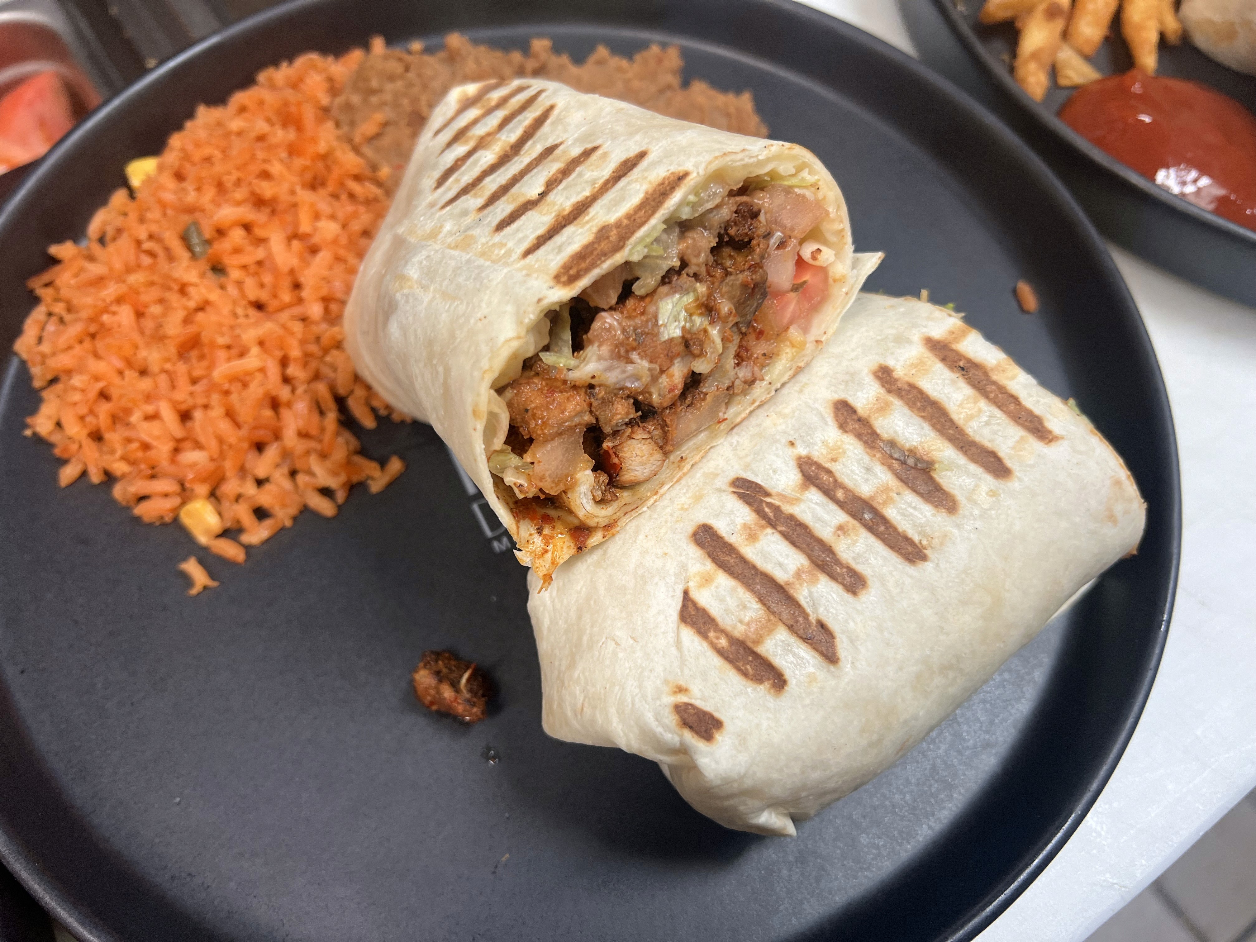 Sliced prime ribeye wrapped with crispy cheese, refried beans, lettuce, avocado, onion, and cilantro. Served with Rice.